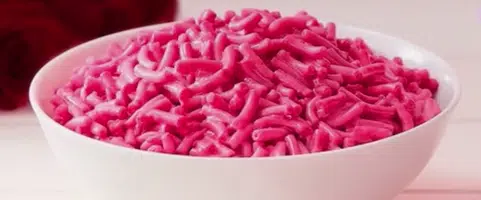 Well fear not. The pink is from crushed up beats, which makes the Mac & Cheese turn pink. So no candy is involved, but even if the orange look is gone, pink mac and cheese doesn’t look that appetizing.
