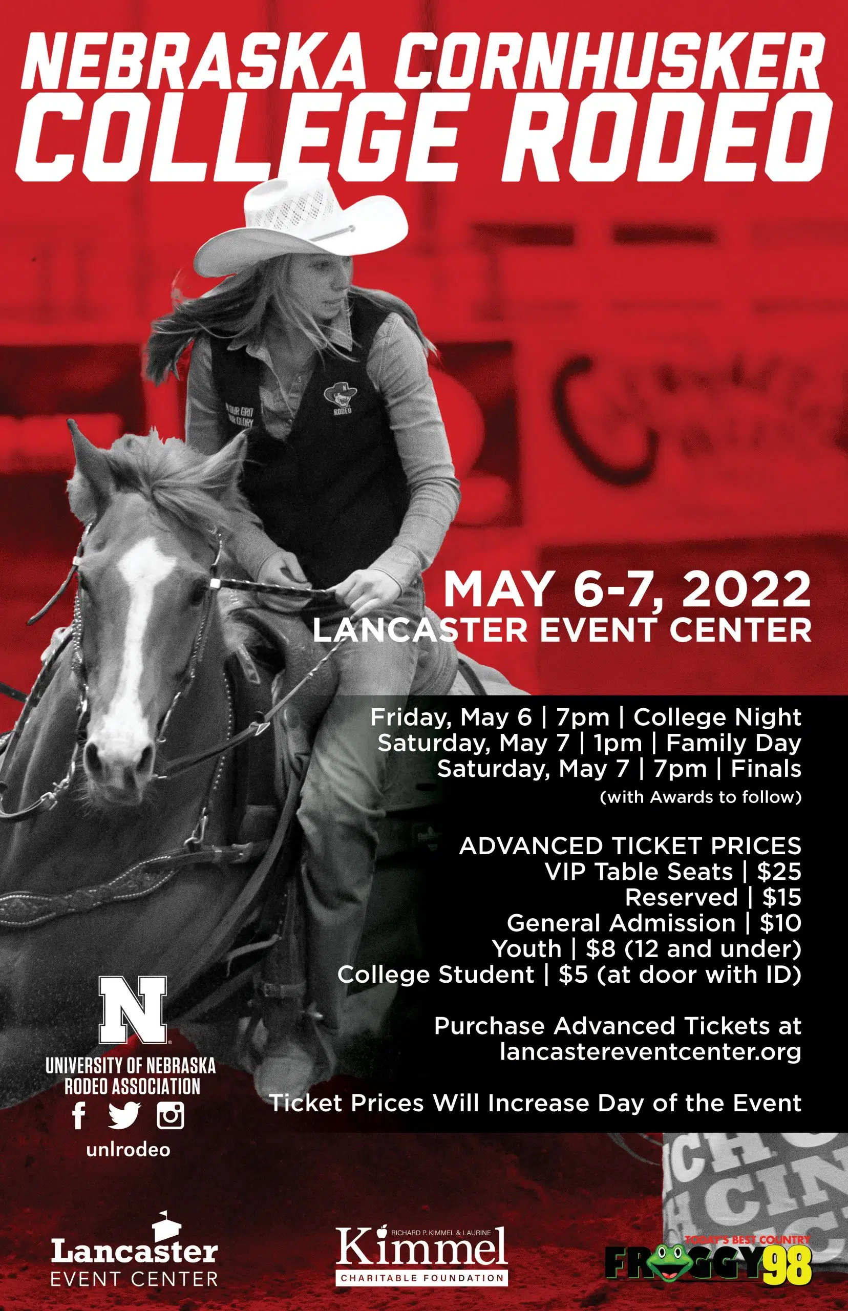 Come and cheer on your University of Nebraska Rodeo Team as they welcome college rodeo athletes from across the Great Plains Region during the 63rd Annual Nebraska Cornhusker Rodeo. Contestants from Nebraska, South Dakota, North Dakota, Iowa, Wisconsin and Minnesota will compete for their chance to represent the Great Plains Region at the College National Finals Rodeo in Casper, Wyoming.