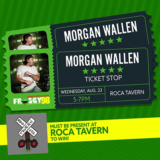 Here's your next chance to win MORGAN WALLEN TICKETS! Join the Froggy 98 crew at ROCA TAVERN on Wednesday, August 23 from 5-7p. We'll be giving away a pair of Morgan Wallen tickets LIVE to somebody in attendance!!!